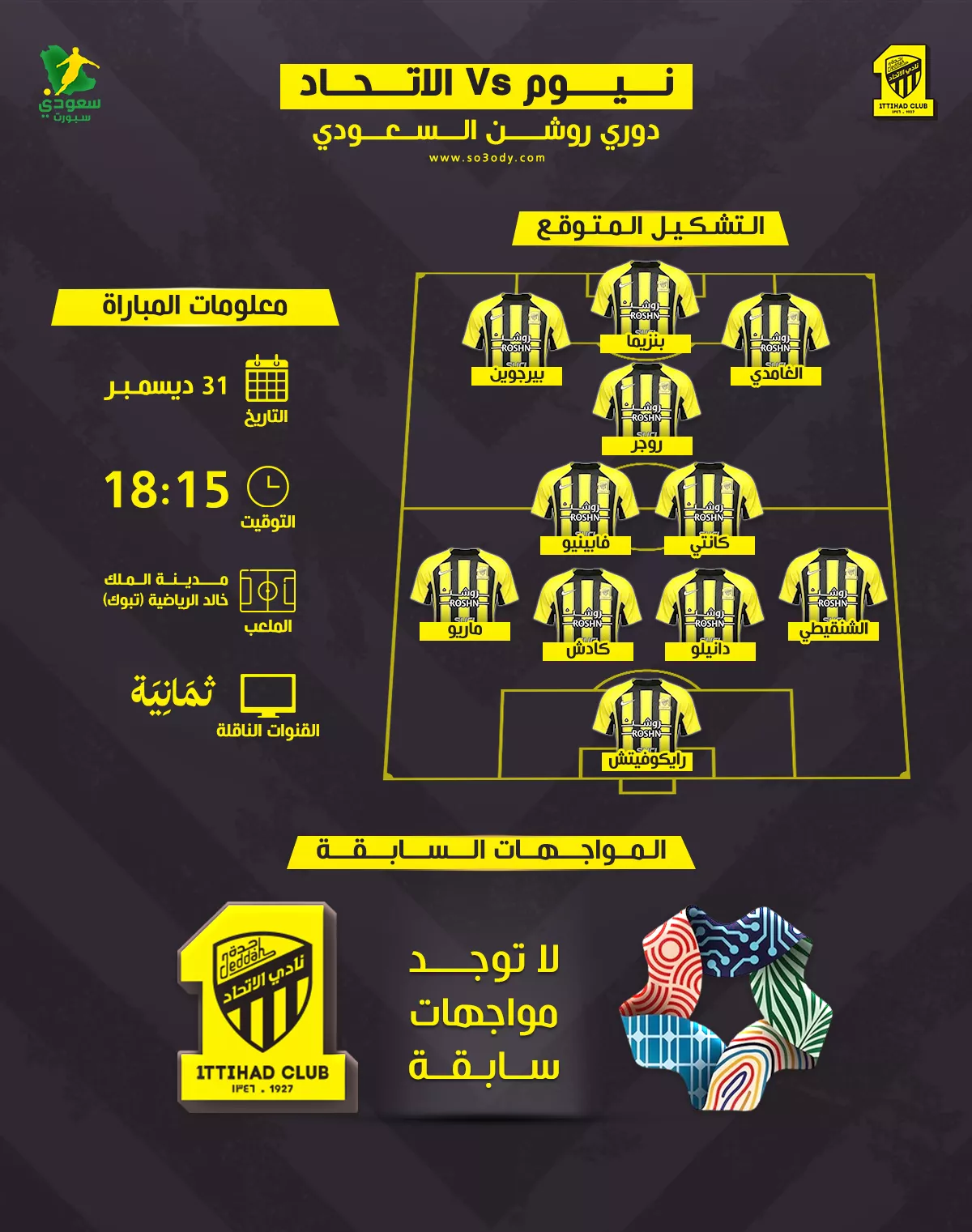 يستعد الفريق الأول لكرة القدم في نادي الاتحاد، تحت قيادة مدربه البرتغالي سيرجيو كونسيساو، لمواجهة هامة وقوية في دوري روشن السعودي للمحترفين، عندما يحل ضيفا على نادي نيوم.