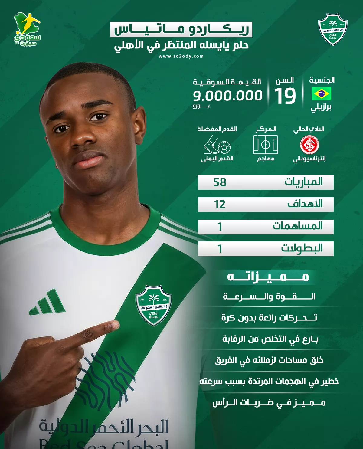 نجح نادي الأهلي في التوصل إلى اتفاق نهائي للتعاقد مع ريكاردو ماتياس لاعب إنترناسيونالي البرازيلي خلال فترة الانتقالات الشتوية المقبلة، في إطار سعيه لتعزيز صفوف الفريق بعناصر شابة وواعدة قادرة على صناعة الفارق مستقبلًا.