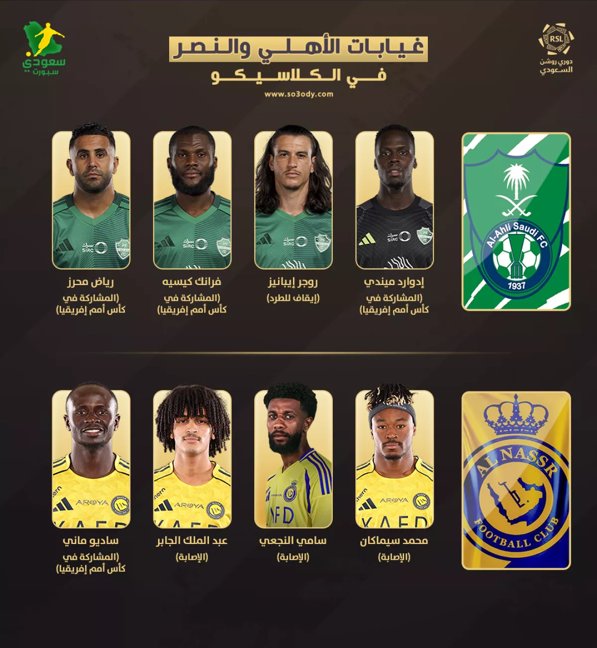 يفقد الأهلي خدمات رباعي الفريق الأول في مباراة النصر، وهم السنغالي إدوارد ميندي، حارس المرمى، والجزائري رياض محرز، جناح الفريق، والإيفواري فرانك كيسيه، لاعب الوسط، وذلك لمشاركة الثلاثي مع منتخباتهم في بطولة كأس أمم إفريقيا المغرب 2025.