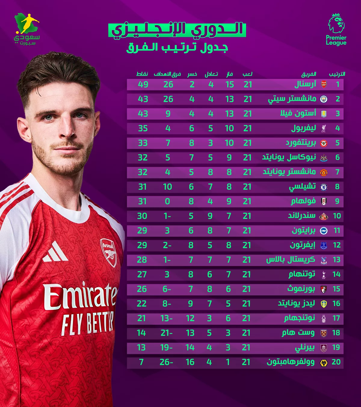| 1 | أرسنال | 21 | 15 | 4 | 2 | 26 | 49 |