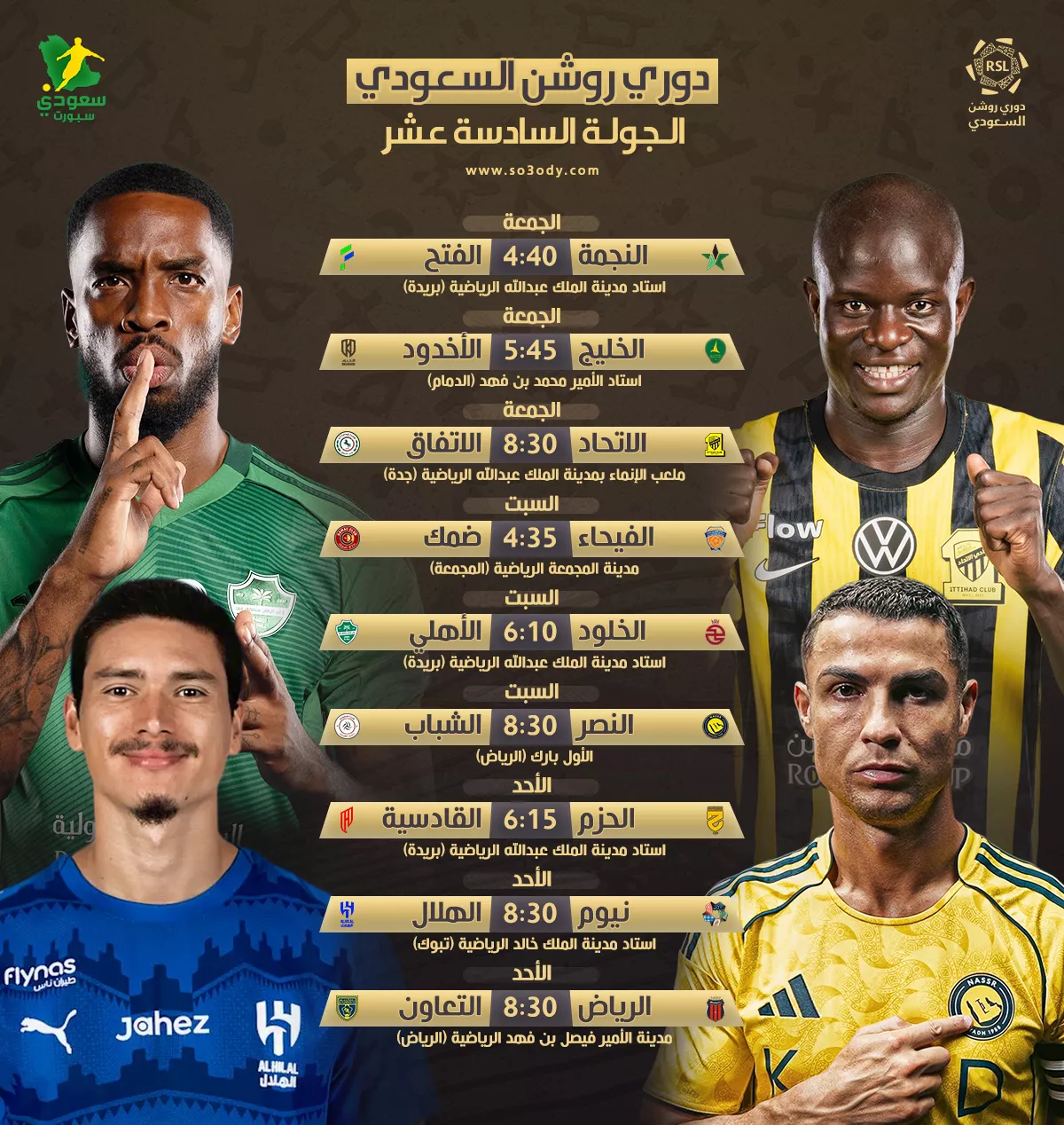 ينتظر عشاق كرة القدم السعودية في كل مكان، انطلاق منافسات الجولة السادسة عشر من منافسات دوري روشن السعودي.