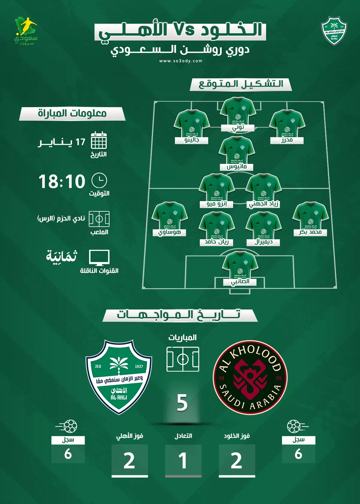 وتقام المباراة التي تجمع بين الأهلي والخلود، ضمن لقاءات الجولة 16 من منافسات دوري روشن، حيث يحتل "الراقي" المركز الرابع في جدول ترتيب الدوري السعودي برصيد 31 نقطة، ويسعى إلى مواصلة انتصاراته.