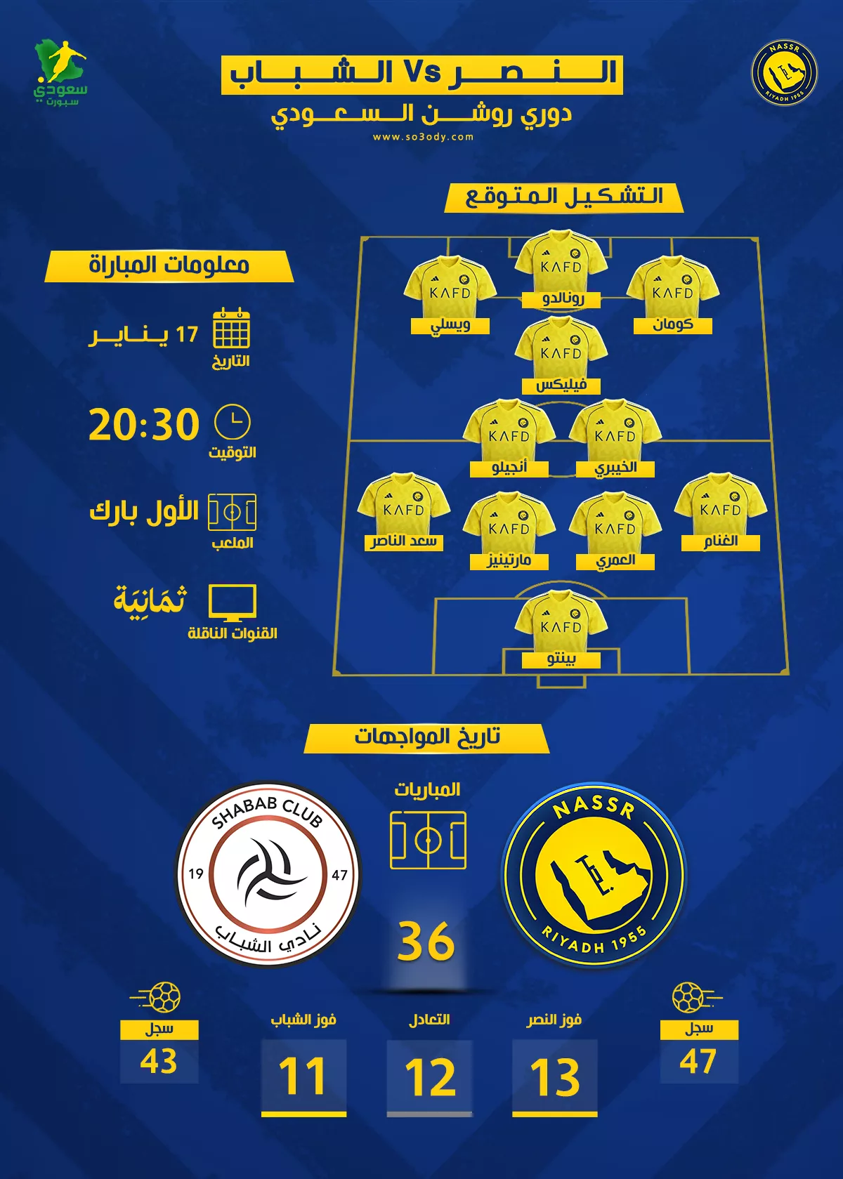 يدخل النصر اللقاء بقوة هجومية ضاربة، حيث استقر الجهاز الفني على الدفع بالعناصر الأساسية لحسم نقاط الديربي. وجاءت التشكيلة المتوقعة كالتالي: