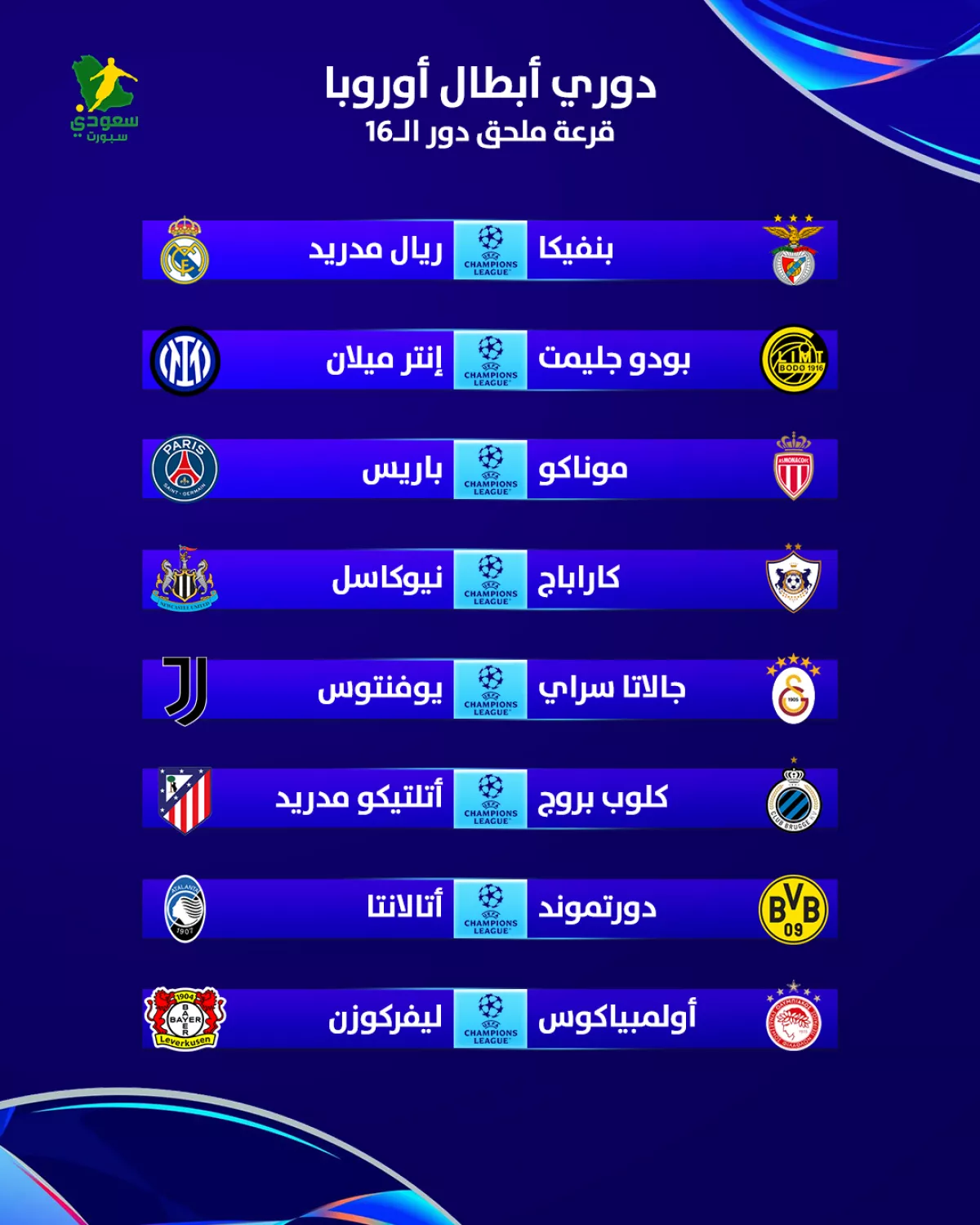أسفرت قرعة الملحق الأوروبي لبطولة دوري أبطال أوروبا عن مواجهات قوية ومثيرة، في مرحلة لا تقبل القسمة على اثنين، حيث تسعى الأندية المتأهلة إلى حجز مقاعدها في دور الـ16 من البطولة القارية الأغلى.