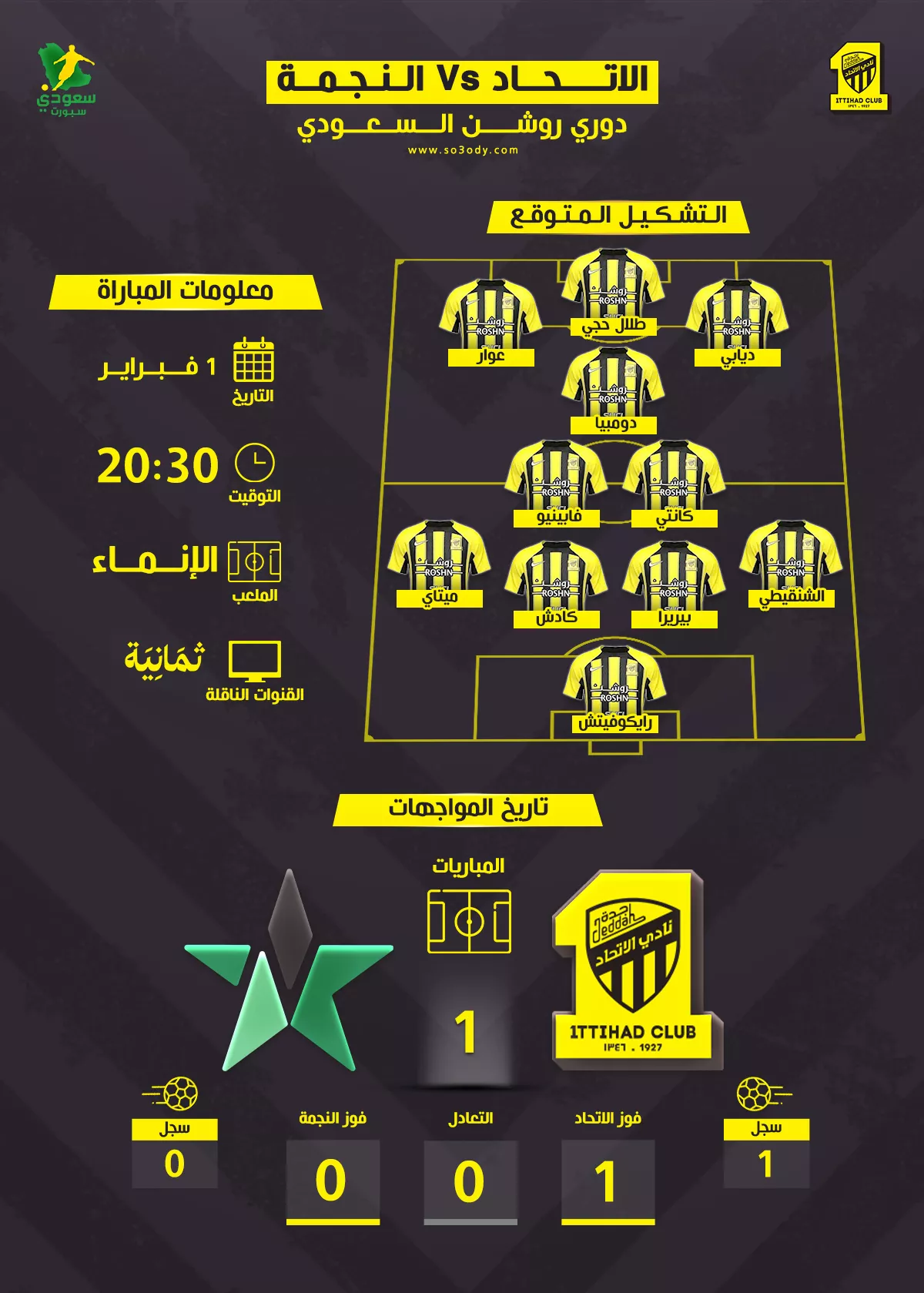 ويحل النجمة ضيفًا على الاتحاد، بملعب الإنماء بمدينة جدة، ضمن منافسات الجولة العشرين من مسابقة دوري روشن للمحترفين.