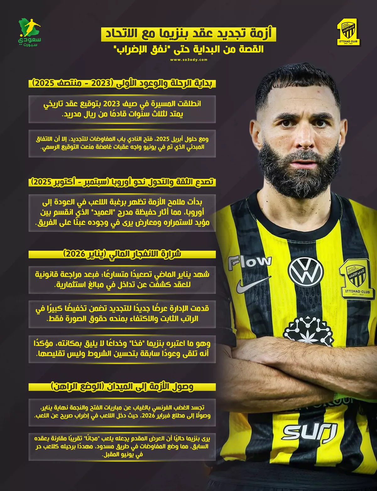1 فبراير 2026 | الإضراب والرحيل المحتمل: دخلت الأزمة نفقًا مظلمًا بتأكيد المصادر العالمية (ليكيب ورومانو) دخول بنزيما في إضراب عن اللعب، معتبرًا العرض الحالي "لعبًا مجانًا" ويخالف الوعود السابقة.