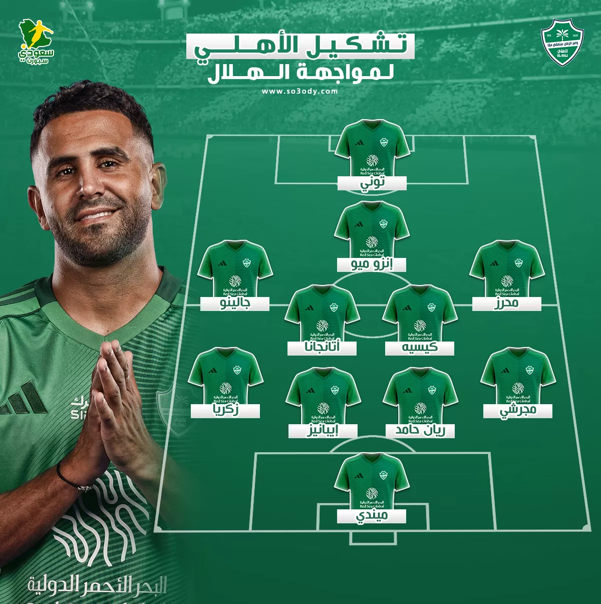 خط الهجوم: رياض محرز، ويندرسون جالينو، إيفان توني
