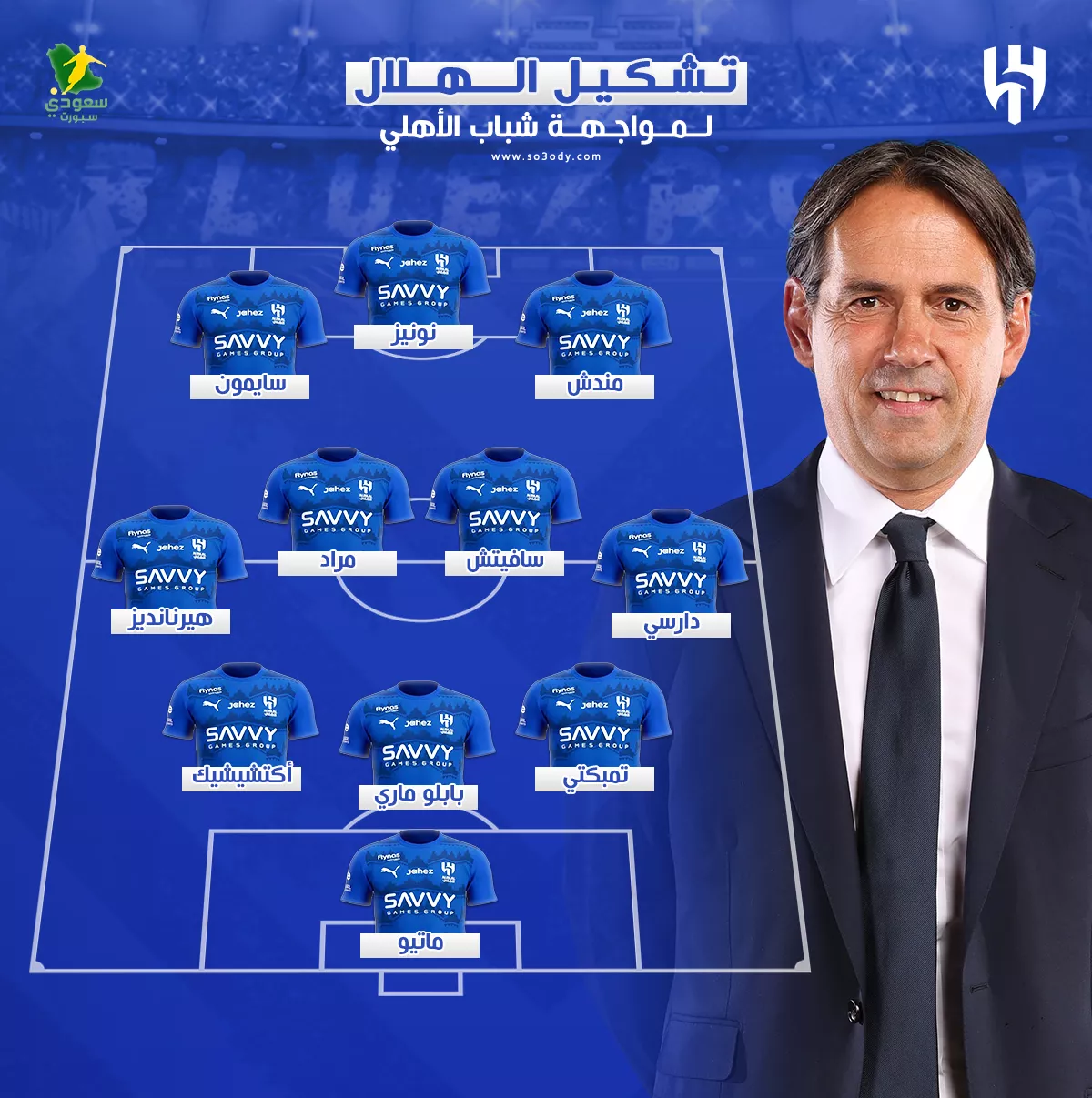 وأعلن الإيطالي سيموني إنزاغي، المدير الفني لنادي الهلال، تشكيل الفريق الرسمي، لمواجهة شباب أهلي دبي، ضمن لقاءات الجولة السابعة من عمر مسابقة نخبة آسيا.