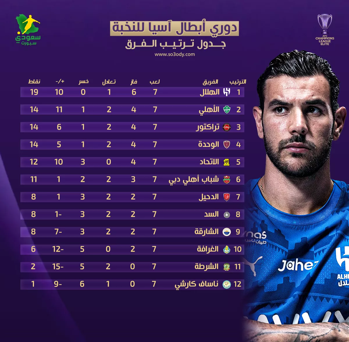 | 1 | الهلال | 7 | 6 | 1 | 0 | 10 | 19 |