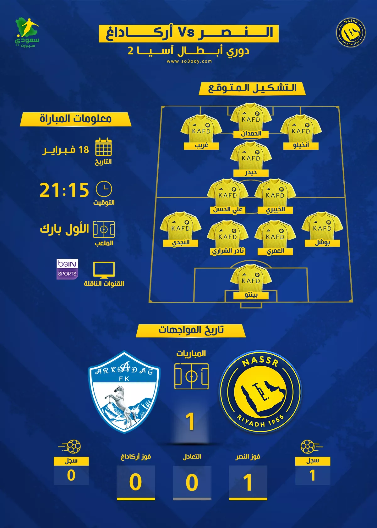 يحتضن ملعب "الأول بارك" بالعاصمة الرياض، مساء غدٍ الأربعاء 18 فبراير 2026، مواجهة هامة تجمع بين نادي النصر السعودي ونظيره أركاداغ التركمانستاني.