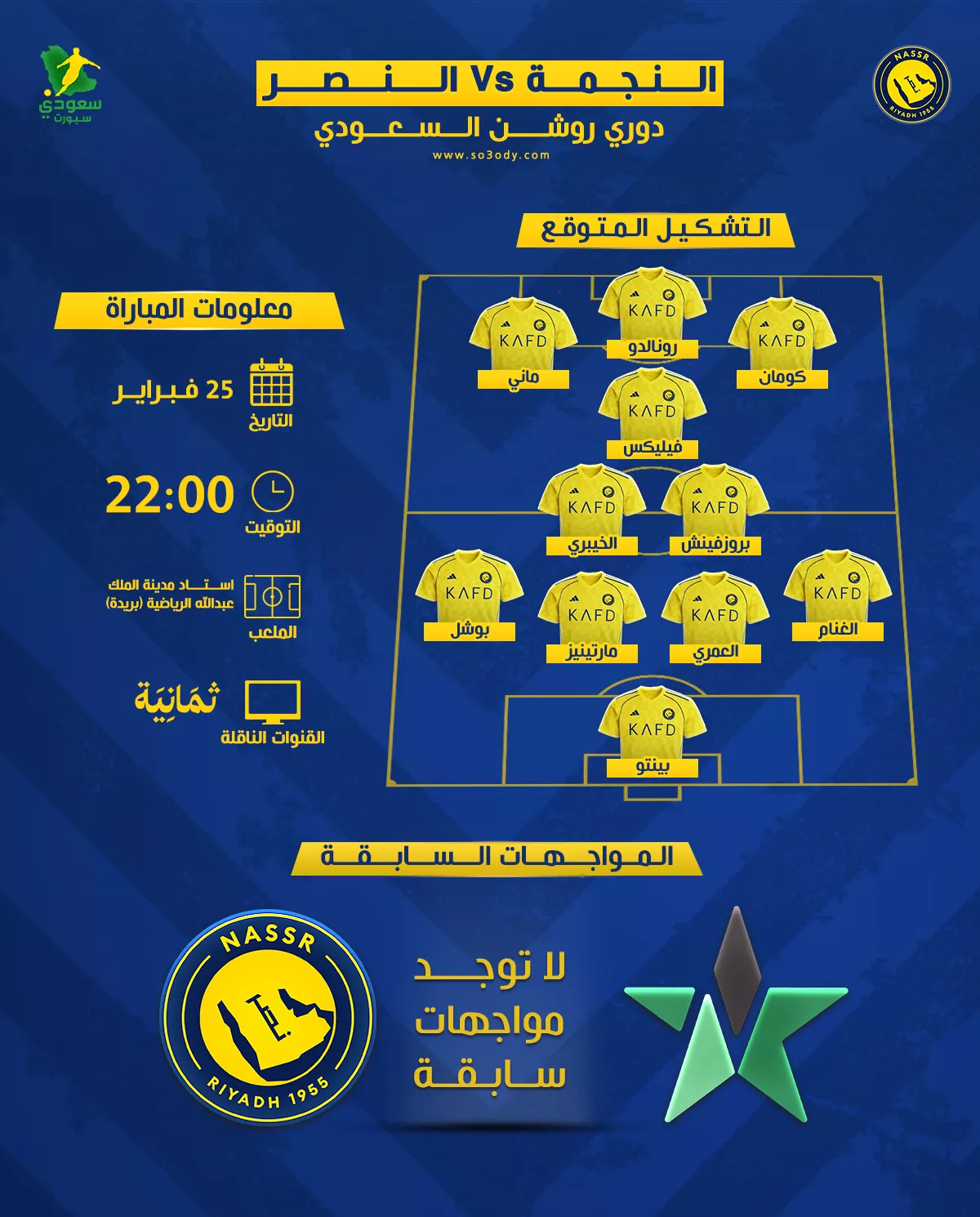 استقر الجهاز الفني لنادي النصر على تشكيلة هجومية يقودها القائد كريستيانو رونالدو، مع تدعيم الوسط بأسماء خبيرة لضمان السيطرة على ريتم المباراة: