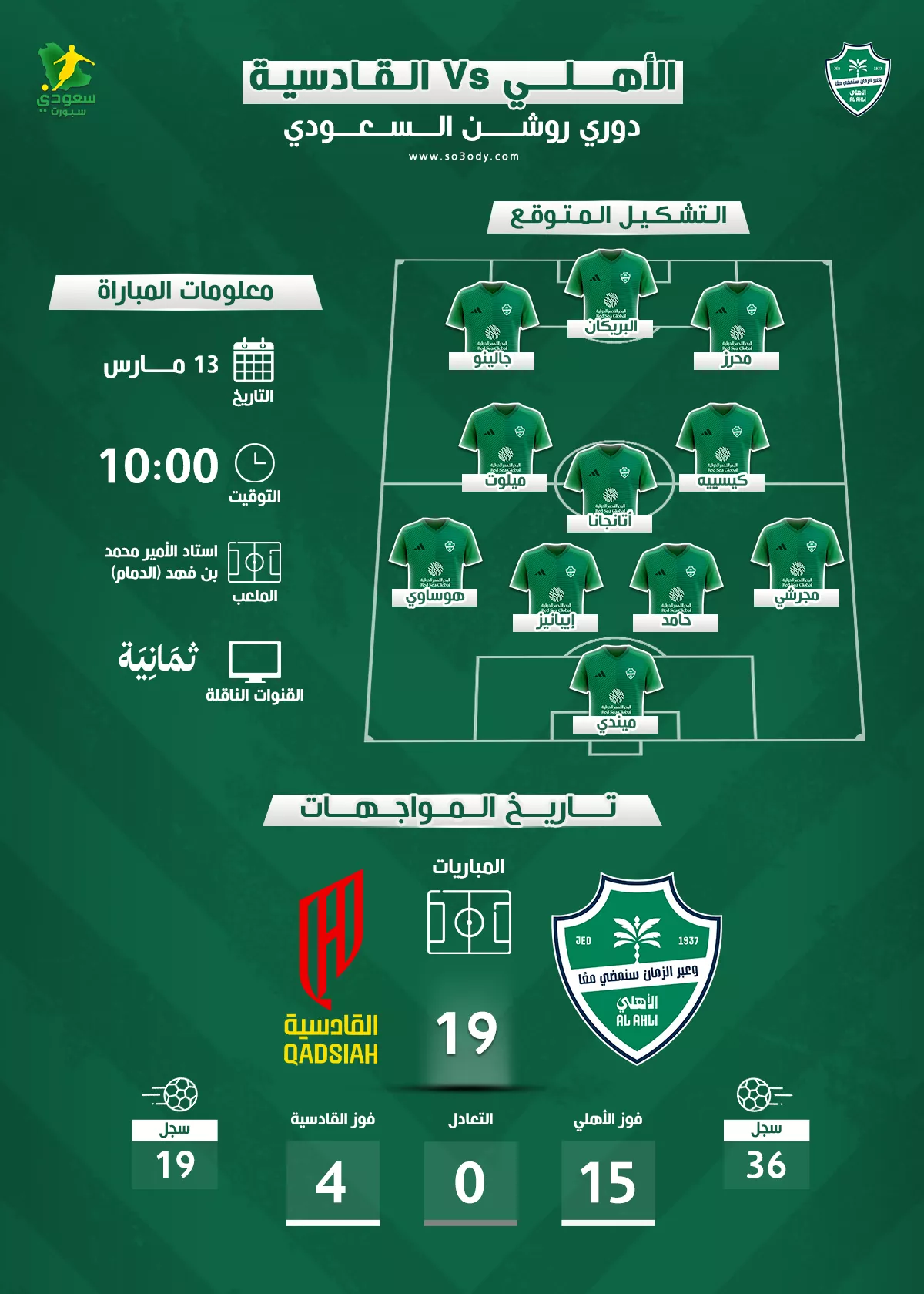 ويدخل الأهلي المباراة وهو في المركز الثاني برصيد 62 نقطة، باحثاً عن الفوز لتقليص الفارق مع المتصدر، بينما يسعى القادسية لاستغلال عاملي الأرض والجمهور لتحسين مركزه في المنطقة الدافئة بجدول الترتيب.