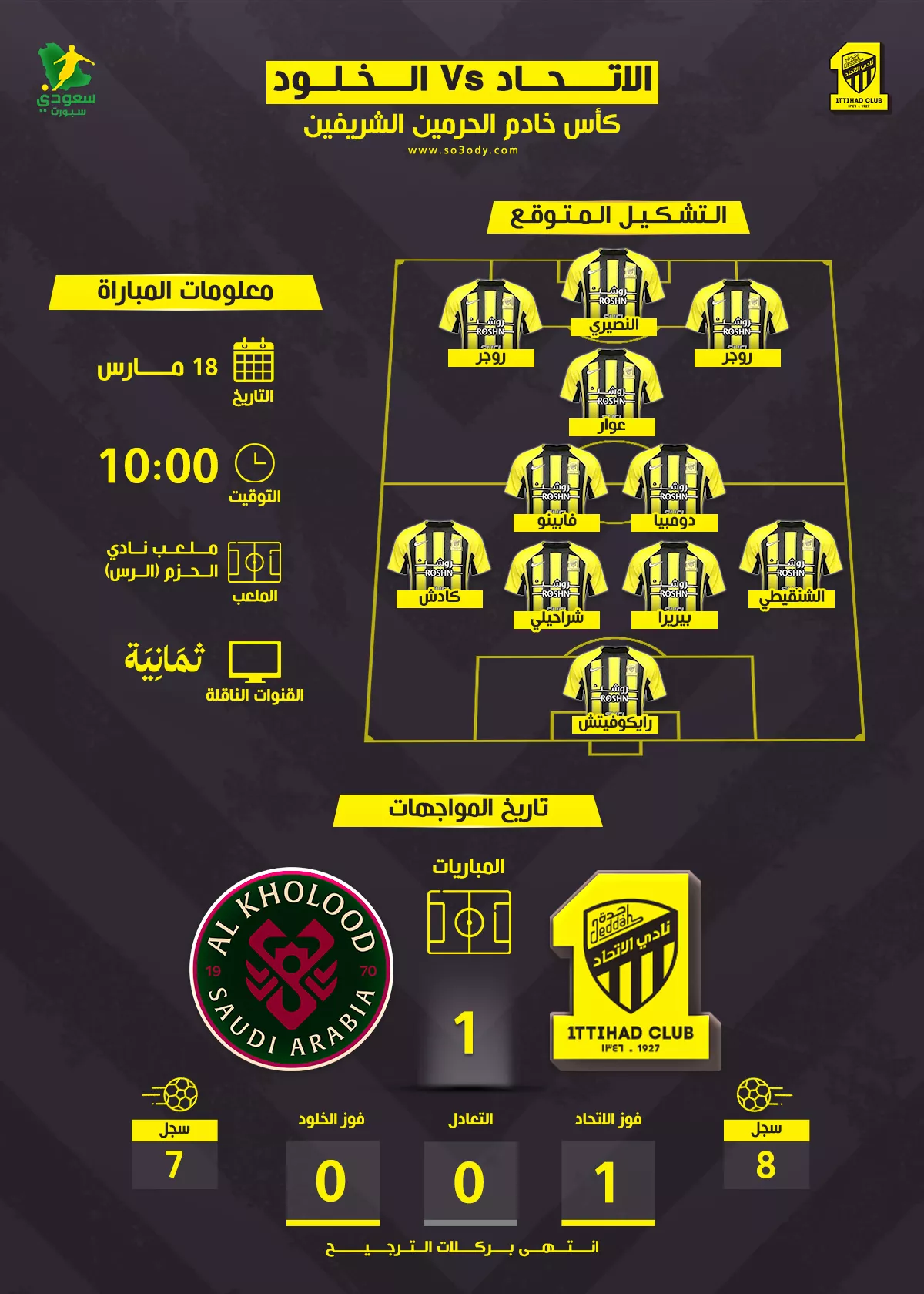 موعد مباراة الاتحاد والخلود في كأس الملك والقنوات الناقلة والتشكيل المتوقع، حيث يسعى العميد بقيادة سيرجيو كونسيساو، لخطف بطاقة العبور للمباراة النهائية، من أجل المنافسة على لقب محلي خلال الموسم الحالي.