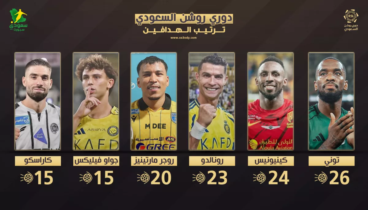 كما يتقاسم المركز الخامس كل من البرتغالي جواو فيليكس، لاعب النصر والبلجيكي يانيك كاراسكو، لاعب الشباب، برصيد 15 هدفًا لكل منهما.