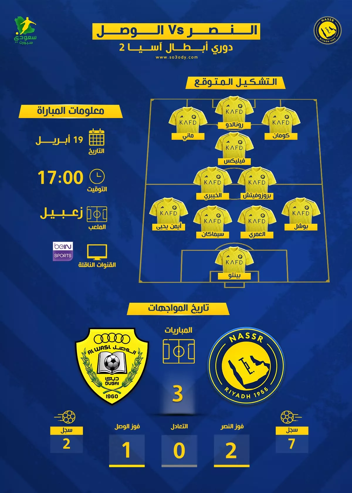 موعد مباراة النصر ضد الوصل الإماراتي والقنوات الناقلة.. تشكيل ناري متوقع للعالمي