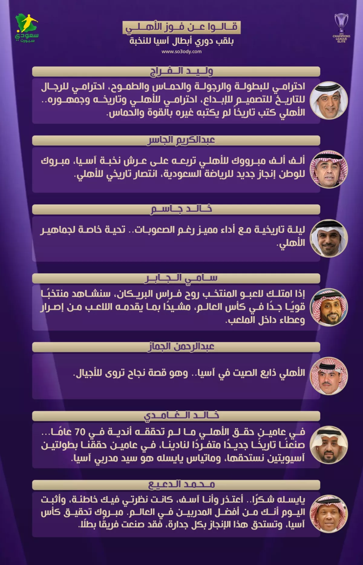 ومن جانبه، بارك الناقد عبدالكريم الجاسر للوطن هذا الإنجاز، مؤكدًا أن الأهلي تربع على عرش النخبة بانتصار تاريخي يضاف لسلسلة نجاحات الرياضة السعودية