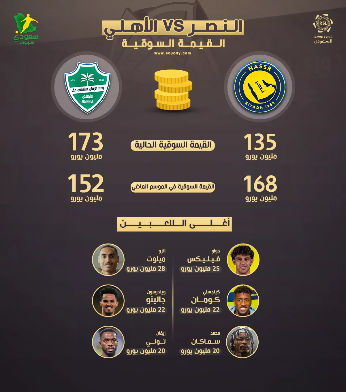 مقارنة القيمة السوقية بين النصر والأهلي (2025 - 2026)