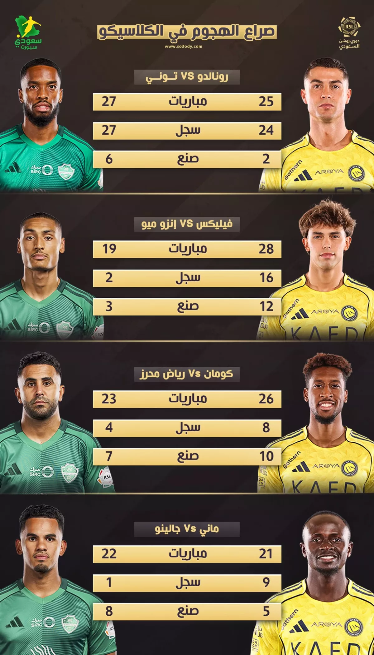 تشهد المباراة صراعات ثنائية مثيرة في مختلف الخطوط، أبرزها في صناعة اللعب بين البرتغالي جواو فيليكس من النصر، الذي سجل 16 هدفاً وصنع 12 في 28 مباراة، مقابل الفرنسي الشاب إنزو ميو من الأهلي الذي سجل هدفين وصنع 3 في 19 مباراة.
