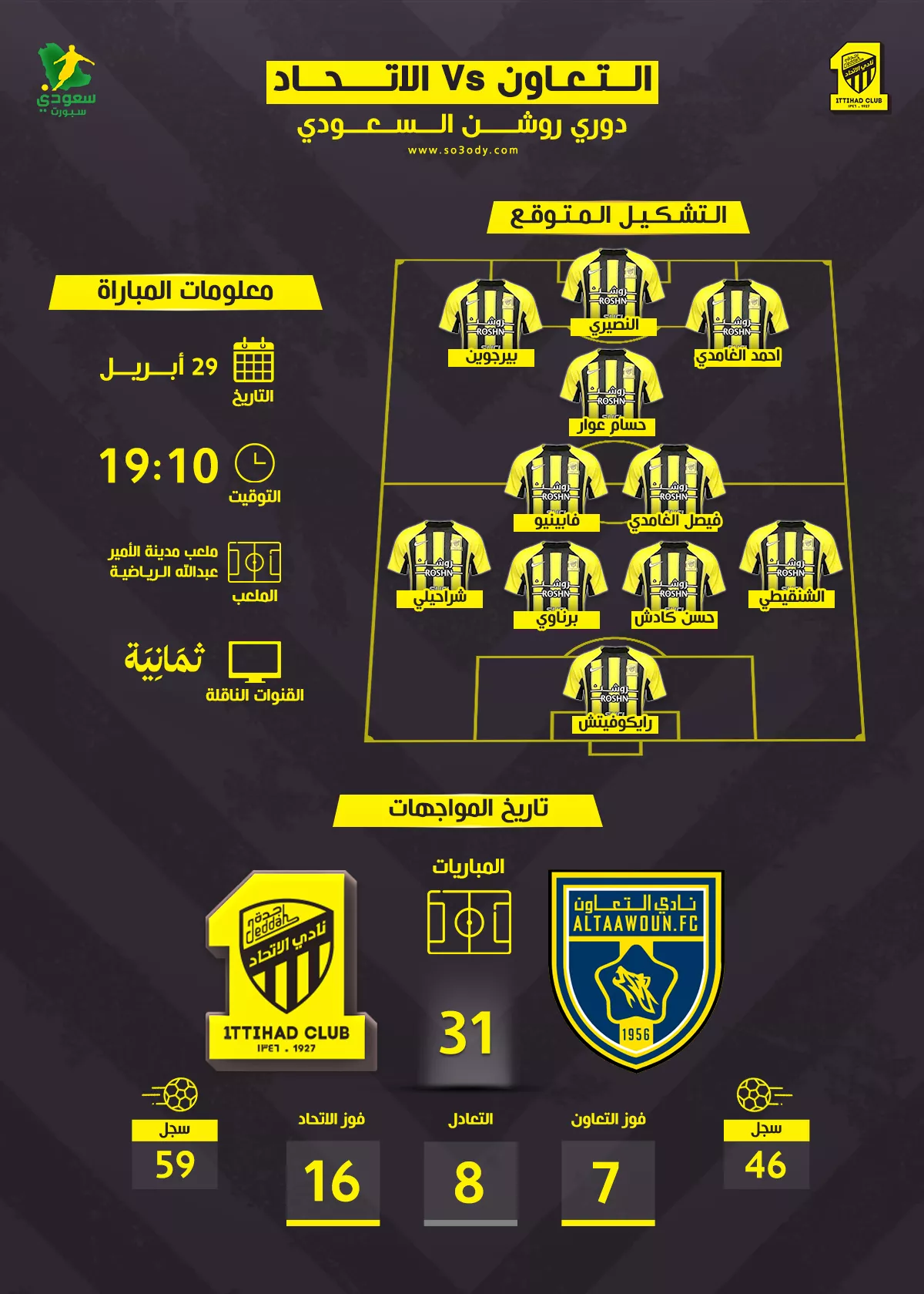 كما يمكن متابعة المباراة عبر موقع سعودي سبورت، الذي ينقل إحصائيات المباراة لحظة بلحظة
