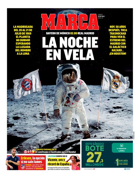 ماركا: منذ الصباح الباكر من 20 يوليو وحتى 21 يوليو عام 1969 لم ينم الكوكب أملًا في وصول الإنسان للقمر.. اليوم وبعد 50 عامًا، سيسهرون لمشاهدة مباراة ريال مدريد الأولى مع الجلاكتيكوس هازار ف هيوستن.