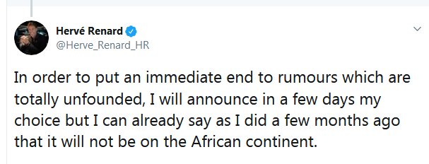 ونشر رينارد رسالة، عبر حسابه الشخصي بموقع التدوينات القصيرة "تويتر"، جاءت كالآتي..
