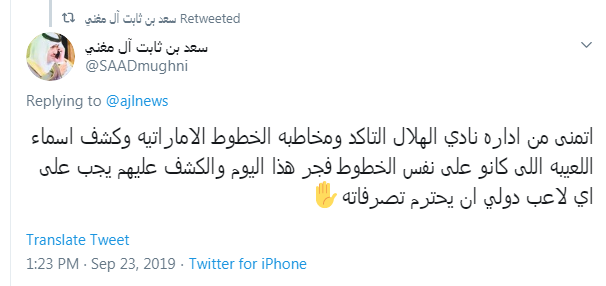 وكتب عضو شرف النصر أن إدارة الهلال، عليها التأكد ومخاطبة الخطوط الإماراتية وكشف أسماء اللاعبين الموجودين على نفس الخطوط فجر هذا اليوم، والكشف عليهم يجب على أي لاعب دولي أن يحترم تصرفاته.