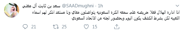 وتابع: إذا أرادت إدارة الهلال الحفاظ على سمعة الكرة السعودية، التواصل معه من أجل الكشف عن أسماء اللاعبين، ولكن بشرط يكون هذا اليوم وبحضور لجنة من الاتحاد السعودي".