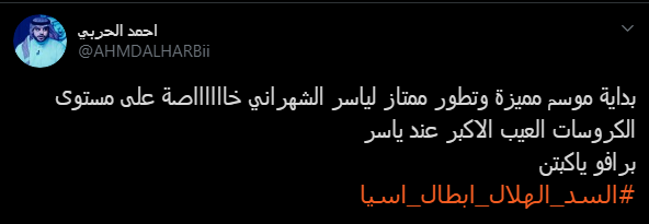 ومن ناحيته أشاد الإعلامي أحمد الحربي، بالمستوى الذي يقدمه ياسر الشهراني في الموسم الحالي، وخاصة أنه عالج نقطة ضعفه وهي العرضيات.