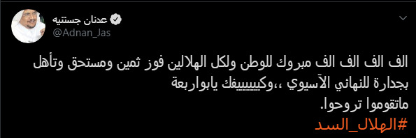 قدم الناقد الرياضي عدنان جستنيه، التهنئة إلى الهلال، بعد الفوز على السد، باعتباره ممثل الوطن، موجهًا سؤالًا مرفقًا بصورة تميم "كيفك يا أبو أربعة".