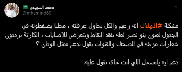 واختتم السبيعي تغريدته، بالقول: "مشكلة الهلال أنه زعيم.. والكل يحاول عرقلته".