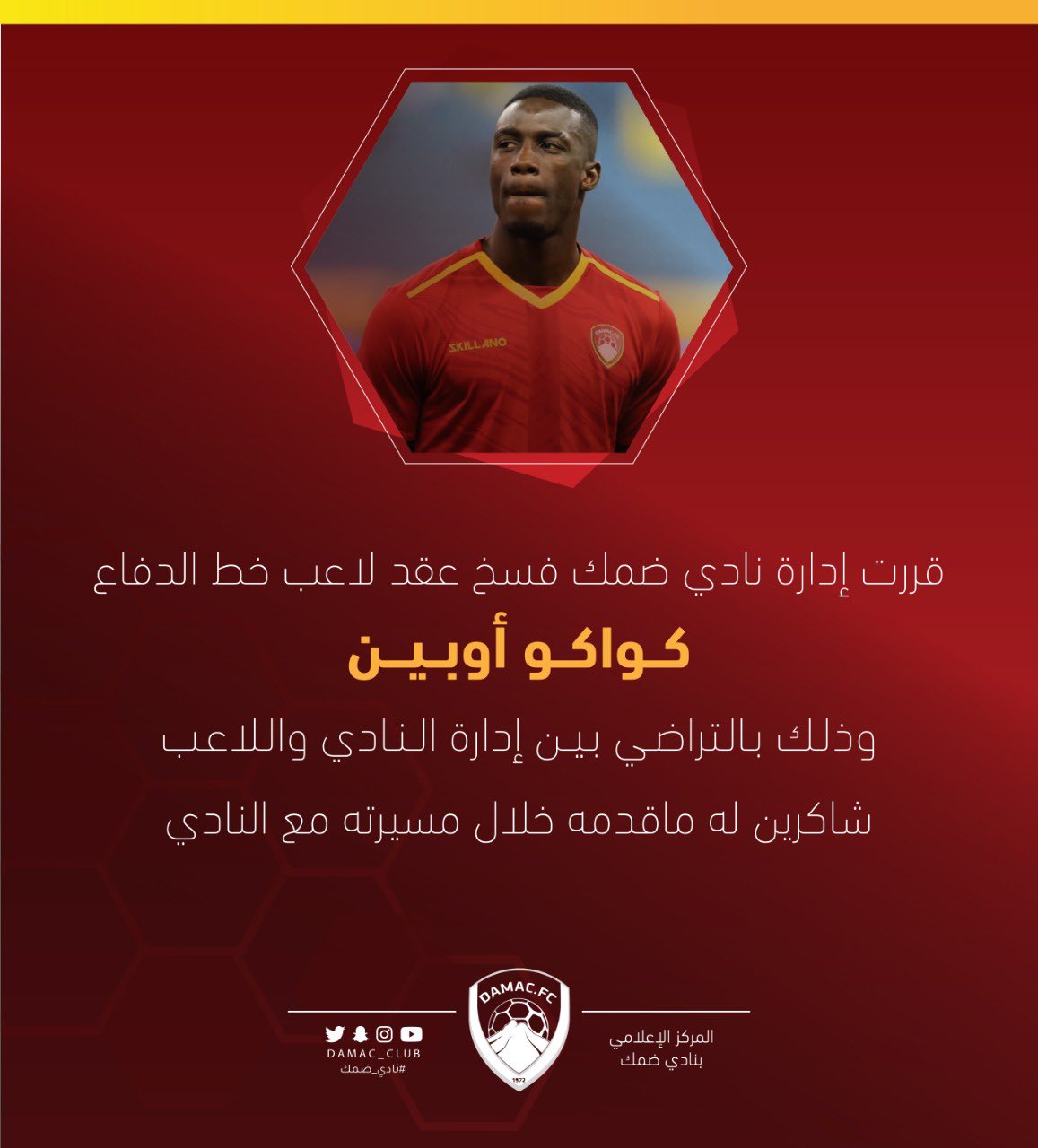 "قررت إدارة نادي ضمك فسخ عقد لاعب خط الدفاع كواكو أوبين، وذلك بالتراضي بين إدارة النادي واللاعب شاكرين له ما قدمه خلال مسيرته مع النادي".