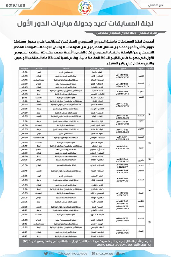 أصدرت لجنة المسابقات برابطة الدوري السعودي للمحترفين، تعديلاتها على جدول مسابقة دوري كأس الأمير محمد بن سلمان للمحترفين، من الجولة 11 وحتى الجولة 15.