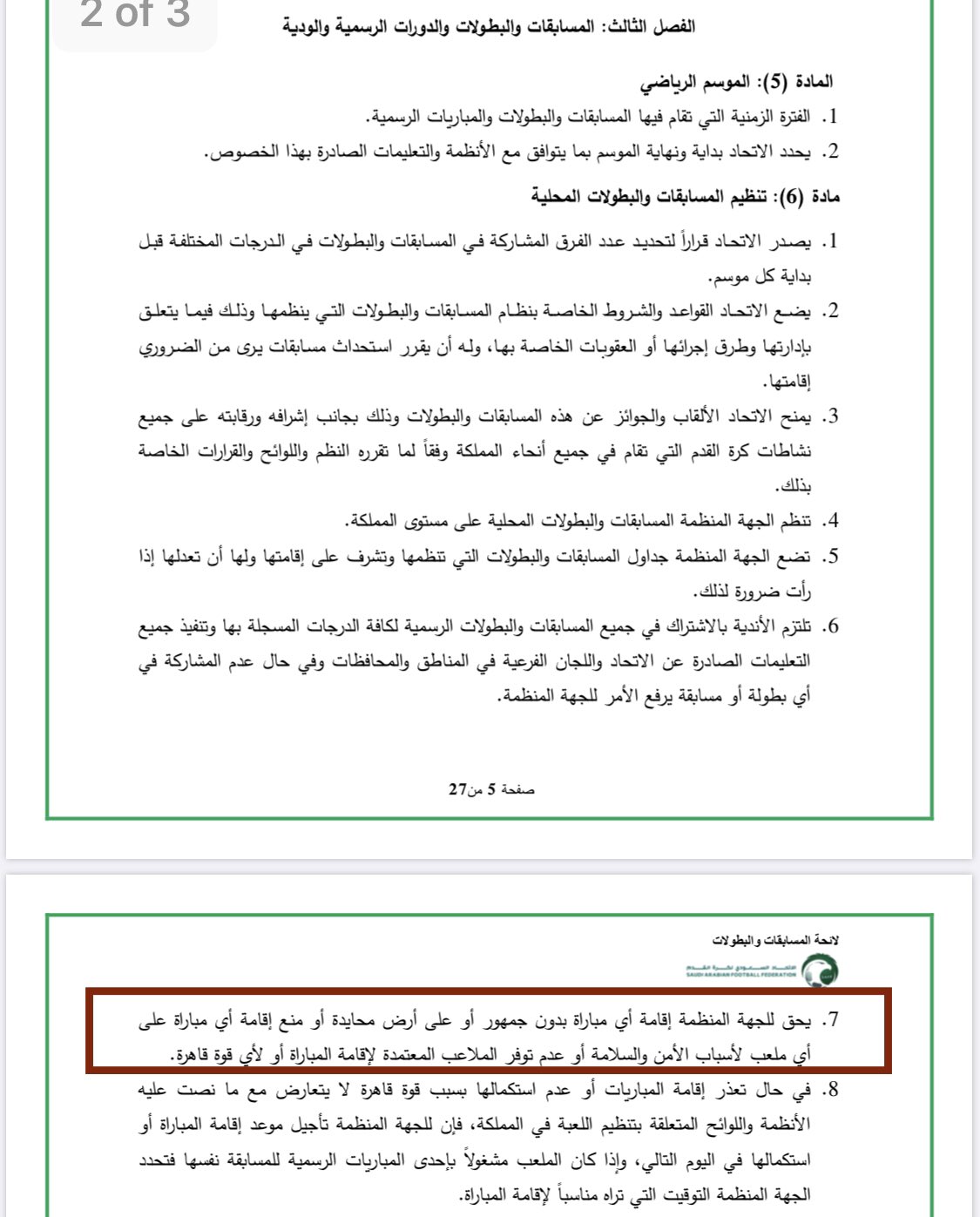 ووفقًا لما ذكره خبير اللوائح والقوانين أحمد الأمير، فإن الاتحاد السعودي لكرة القدم، يملك الحق في تأجيل أو إلغاء مسابقتها ومنافساتها للمصلحة العامة.