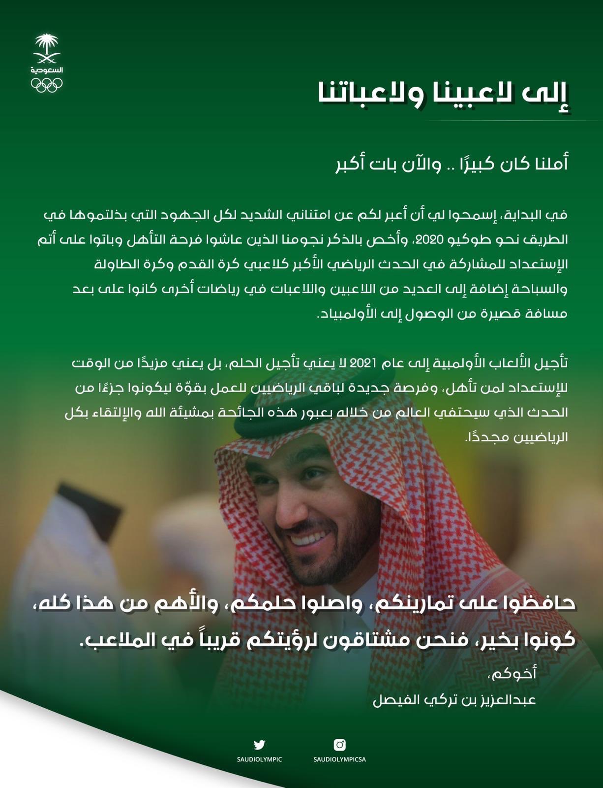 وجه سمو الأمير عبدالعزيز بن تركي الفيصل، وزير الرياضة، رسالة هامة وعاطفية، إلى جميع لاعبي ولاعبات المملكة، بعد تأجيل أولمبياد طوكيو رسميًا.