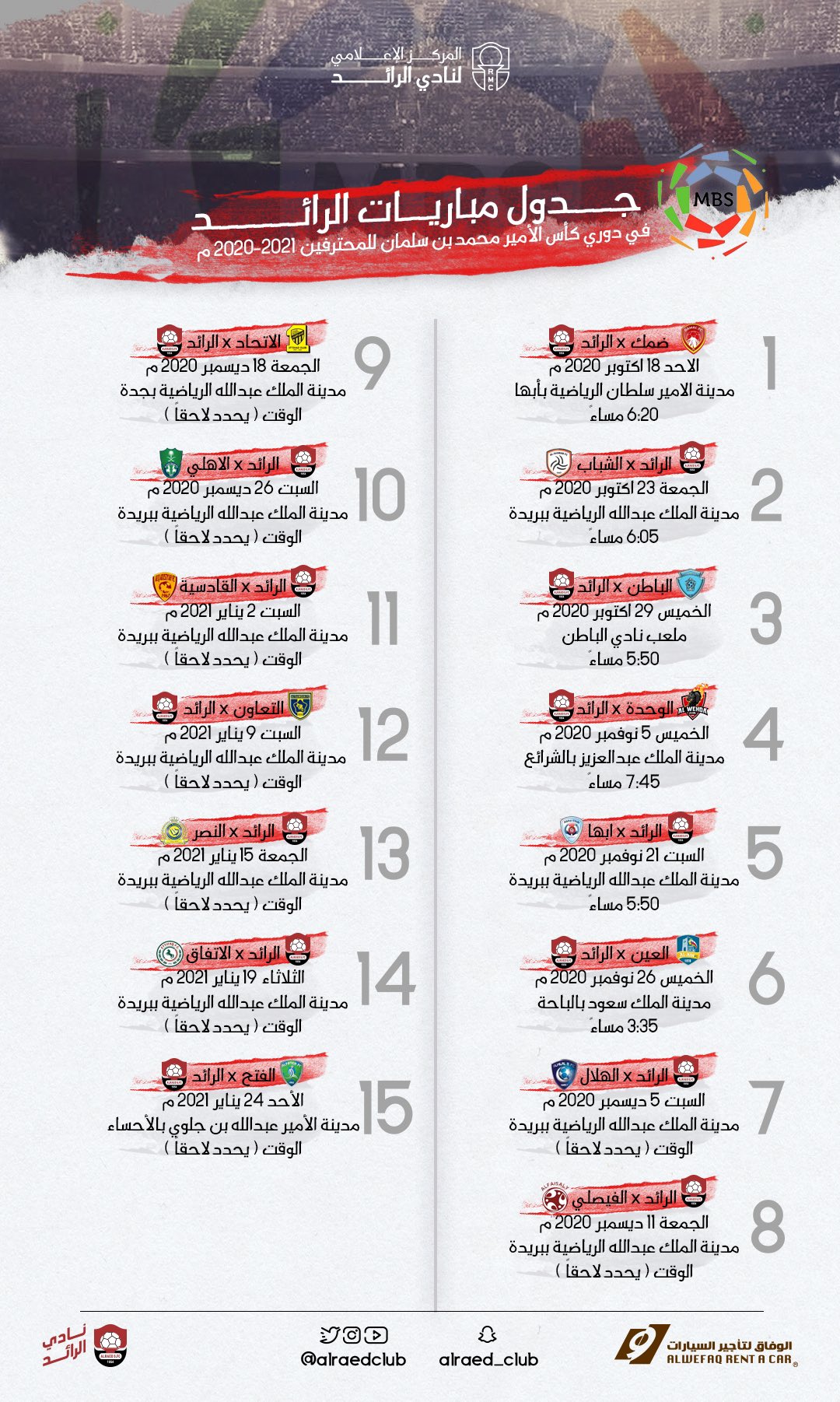ويستهل الرائد الموسم الجديد بدوري المحترفين، بملاقاة ضمك في 18 أكتوبر، على ملعب مدينة الأمير سلطان الرياضية بأبها، في الجولة الأولى من دوري كأس الأمير محمد بن سلمان للمحترفين.