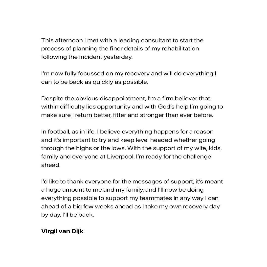 وقال فان دايك في بيانه: "التقيت بالأخصائي اليوم من أجل بدء عملية إعادة التأهيل وذلك بعد إصابتي بالأمس، أنا مركز بشكل كامل على عودتي وسأقوم بكل ما لدي للعودة بأسرع ما يمكن".