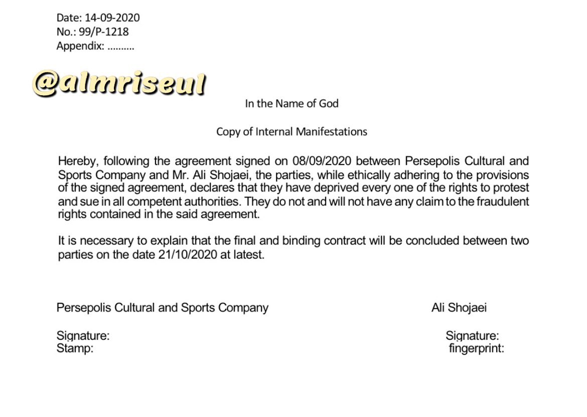 وعرض المريسل عبر صفحته بموقع التدوينات القصيرة "تويتر"، وثيقة تكشف عن توقيع نادي بيرسيبوليس، اتفاقية مع اللاعب علي شجاعي، في تاريخ 8 سبتمبر 2020، لضمه إلى الفريق الأول لكرة القدم.