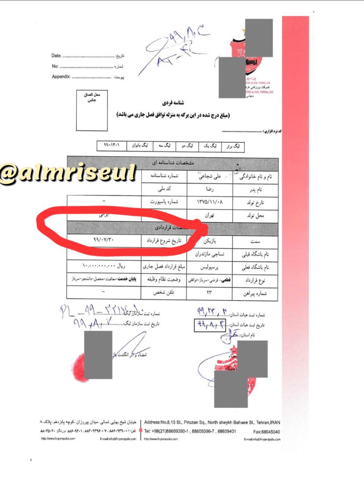 والوثائق التي عرضها المريسل، كشفت عن توقيع بيرسبوليس رسميًا، مع شجاعي، في يوم 21 أكتوبر 2020، حيث تم الرفع إلى الاتحاد الإيراني، في 23 من نفس الشهر، قبل انطلاق الدوري المحلي.