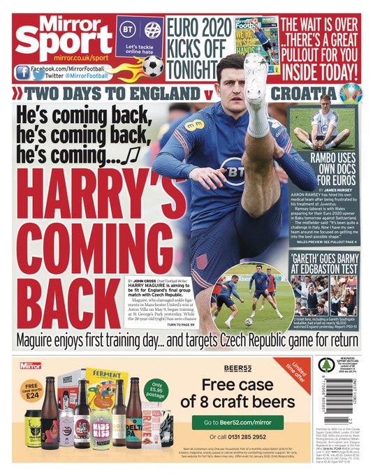 سلطت الصحف الرياضية العالمية اليوم الجمعة، الضوء على انطلاق بطولة الأمم الأوروبية يورو 2020، بالإضافة إلى صدمة ماجواير للمنتخب، ومدة غياب هاري كين مباريات إنجلترا بسبب الإصابة.