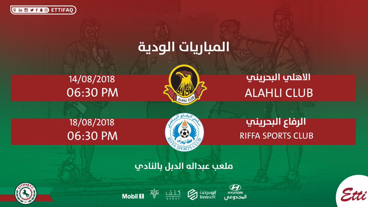 كشف نادي الاتفاق، عن مواجهة فريقي الأهلي والرفاع البحرينيين، ضمن استعدادات الفريق لمنافسات الموسم القادم.