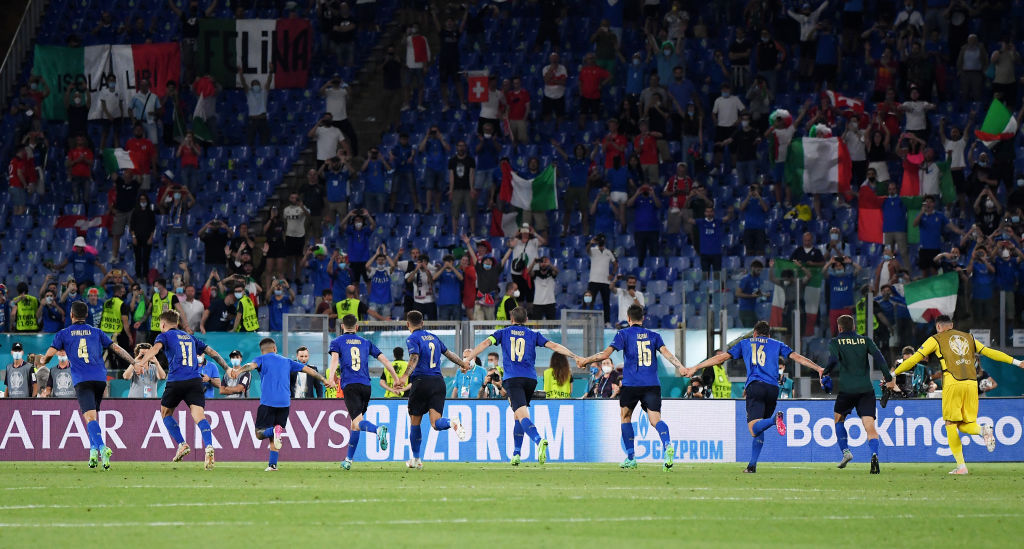 احتفل المنتخب الإيطالي بتأهله إلى دور ثمن النهائي، مع الجماهير الحاضرة في ملعب أولمبيكو بالعاصمة روما، في مشهد، لم نعشه كثيرًا منذ ظهور فيروس كورونا الصيني.