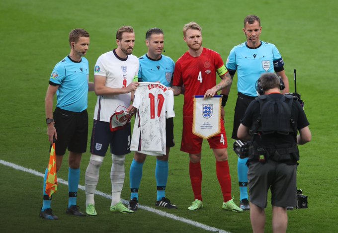 وقبل انطلاق مباراة اليوم، قدم هاري كين، قائد إنجلترا، قميص المنتخب الإنجليزي، موقع عليه من قبل جميع اللاعبين لدعم إريكسن.