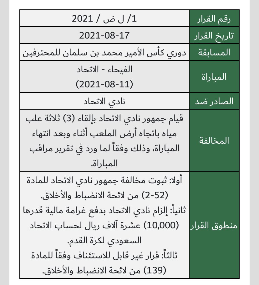وعاقبت "الانضباط"، نادي الاتحاد، بغرامة مالية قدرها 10 آلاف ريال؛ بسبب رمي جماهيره، 3 علب مياه، خلال مواجهة الفيحاء.
